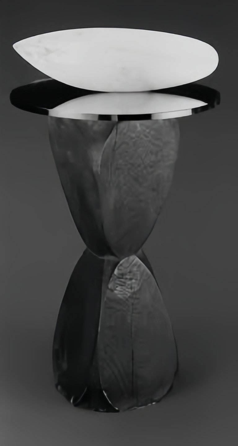 Marbre veiné jaunâtre sur disque miroir et socle en chêne.