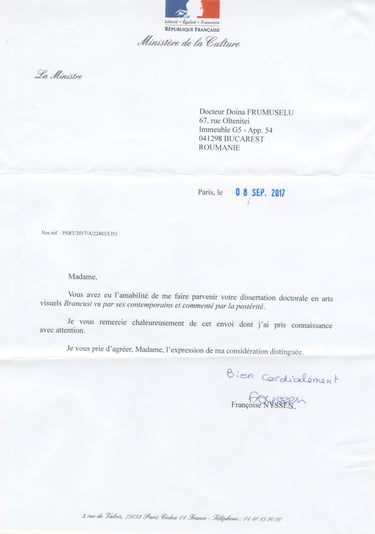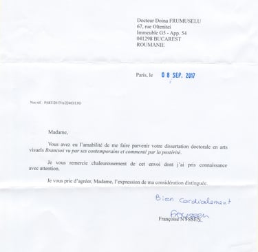 This article brings together testimonials and letters of recommendation from leading figures in Brancusi studies and art history, including Barbu Brezianu, Sidney Geist, and Radu Bogdan, as well as from the French Ministry of Culture. These documents highlight the scientific rigor and intellectual independence of Doina Frumuselu, particularly in her research on the corrosion of the Endless Column and in her doctoral dissertation devoted to Constantin Brancusi. The collection presents rare documents retracing the career of a researcher who has become a recognized reference in Brancusi studies.