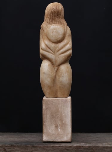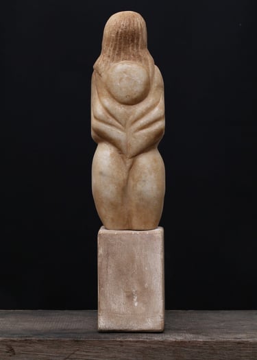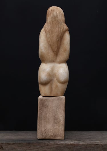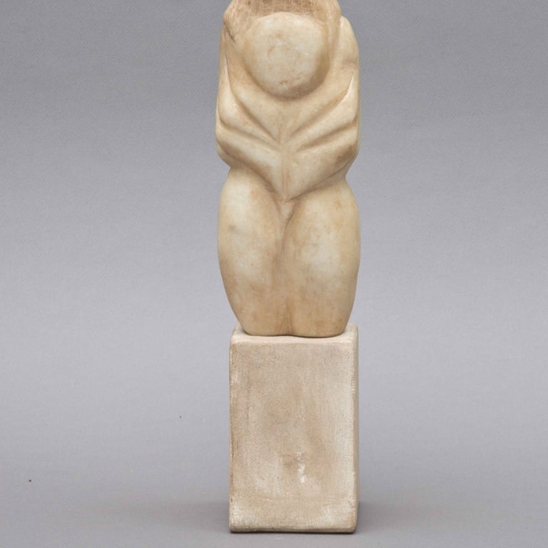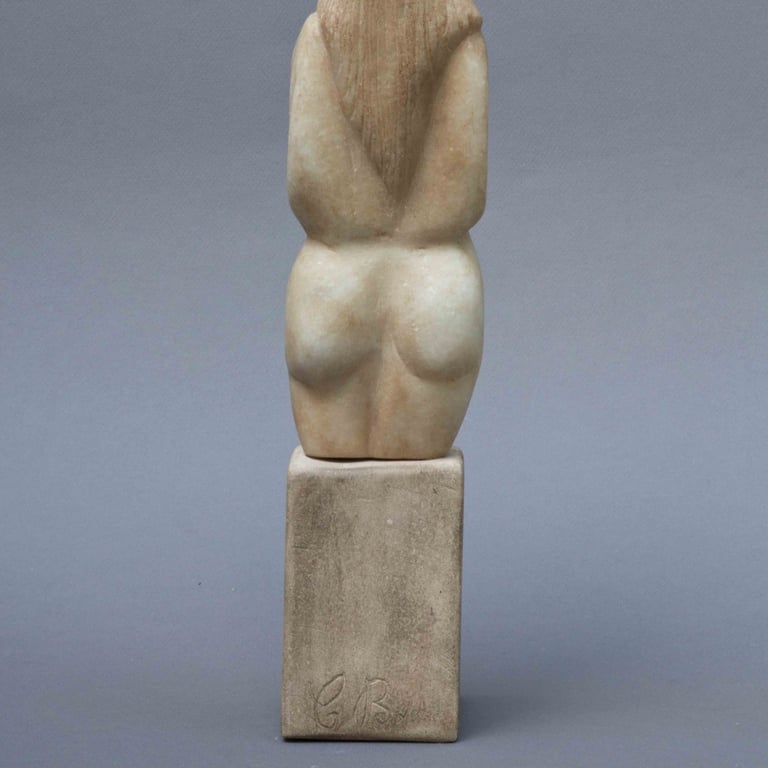 Torse de jeune fille aux jambes tronquées, la tête cachée sous une chevelure abondante. Geste pudique des bras, formes symbolisant l’amour aveugle et la féminité. Sculpture aux lignes cubistes, mêlant sensualité, équilibre et géométrie, typique de la période parisienne de Brancusi (1907–1909).