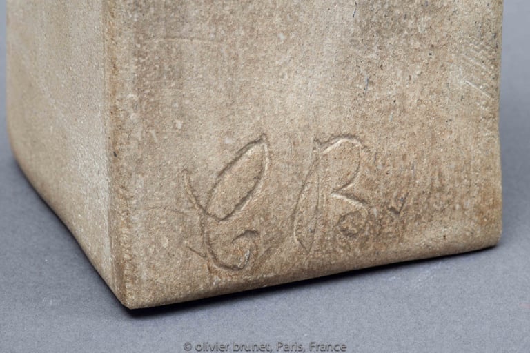 Le torse est signé à la base par une inscription incisée en lettres calligraphiques : C Br (photo 6). Le socle en pierre, de forme tronconique pyramidale, porte la même signature sur la grande surface trapézoïdale inférieure (photo 7).