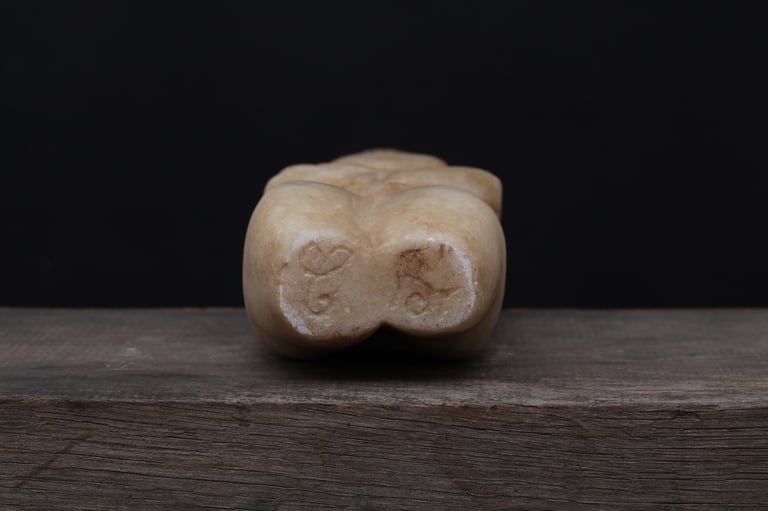 En observant la ligne médiane de la pièce, on constate une asymétrie entre les deux parties, perceptible dans la forme des cuisses (photo 1), des fessiers (photo 2) et dans la disposition de la chevelure sur les épaules droite et gauche (photos 4 et 5). On peut dire que le côté gauche apparaît plus masculin que le droit, mais ensemble ils forment un être unique, en parfaite harmonie.