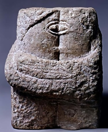 Les yeux passent de contours en amande sculptés dans la pierre (Figure B) à une ligne semi-circulaire fusionnée, formant un œil cyclopique (Figures D, G, H et I).