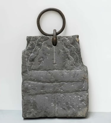 Figure E : Médaillon (Le Baiser), pierre volcanique, 1919 ; anneau double en acier ; dimensions : 58,5 x 47,5 x 9,3 cm (Centre Pompidou, Atelier Brancusi, Paris)