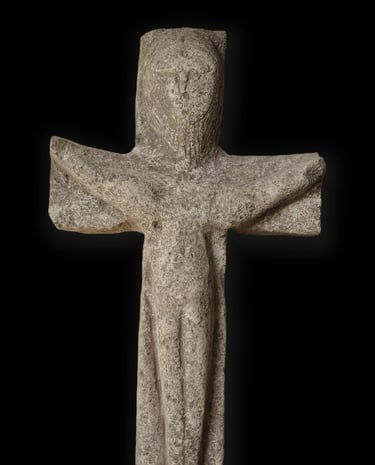 Le Crucifix de Brancusi est une représentation typique de l'Église Catholique, à laquelle le sculpteur introduit de manière innovante quelques éléments propres aux icônes byzantines : grands yeux, petite bouche, nez droit et fin, cheveux et barbe rendus en mèches légèrement ondulées.