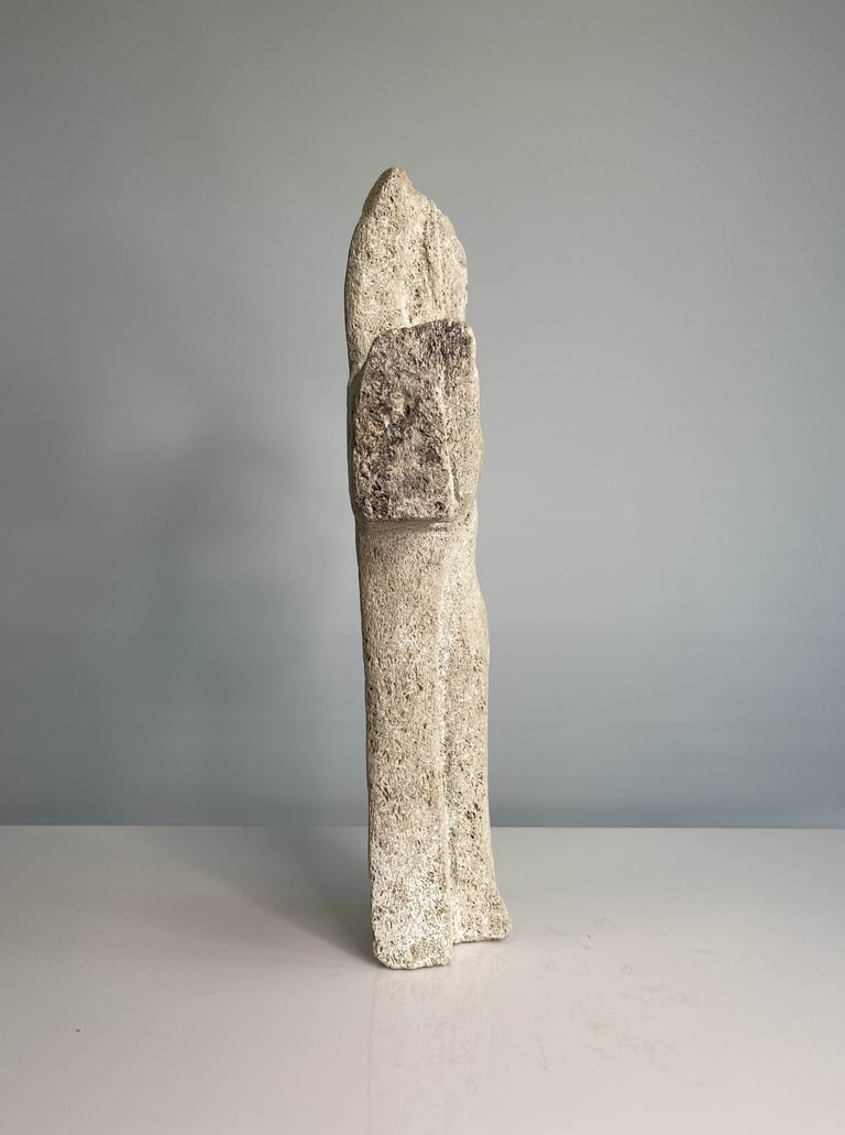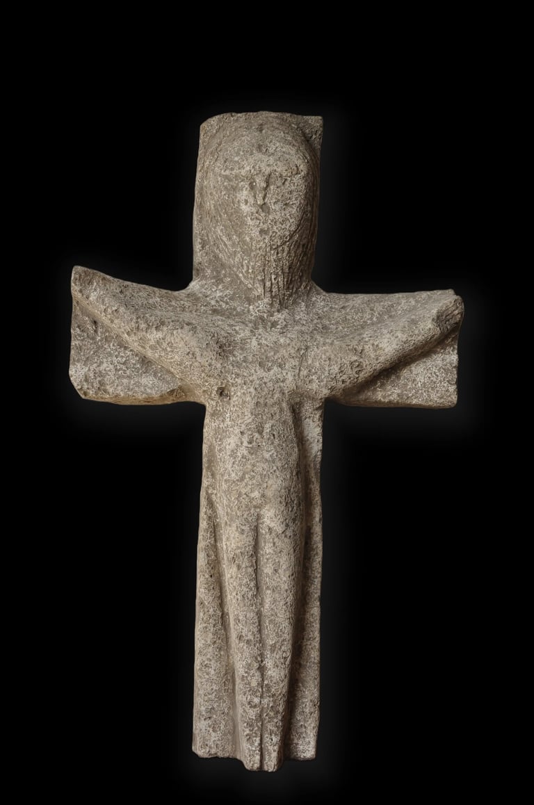 The Crucifix in stone is sculpted in high relief, measuring 43.0 × 25.5 × 7.0 cm, with an incised inscription on the back bearing the signature, location, and date: “C. Br. CRAIOVA 1895”. Brancusi created this sculpture during his years at the School of Arts and Crafts in Craiova, outside the school curriculum.