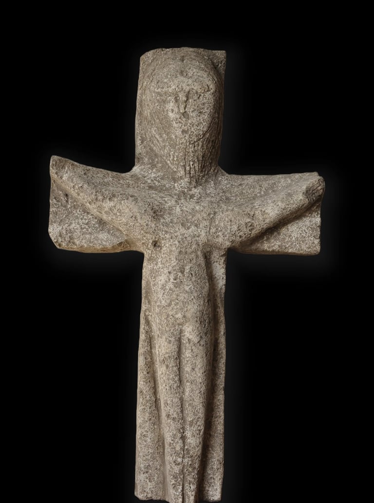 Brancusi’s Crucifix is a typical representation of the Catholic Church, into which the sculptor innovatively introduces certain elements characteristic of Byzantine icons: enlarged eyes, a small mouth, a straight and slender nose, and hair and beard depicted in slightly wavy locks.